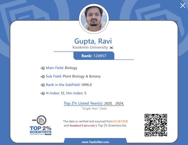 We are pleased to share that Dr. Ravi Gupta, one of our founding members, has been recognized as one of the top 2% scholars in biology worldwide for both 2024 and 2025. This recognition, based on citation metrics and research impact analysis, acknowledges researchers who have made meaningful contributions to their fields.