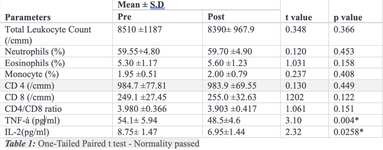The immunological parameters were analysed using blood samples collected pre- and post-exposure to simulated microgravity. The parameters included: total leukocyte count, differential leukocyte count, CD4 count, CD8 count, CD4/CD8 ratio, and serum IL-2 (an adaptive immune cytokine) and TNF-α (an innate immune cytokine) levels. There was no statistically significant change in the CD4 count, CD8 count or CD4/CD8 ratio. However, there was a substantial reduction in serum TNF-α (p=0.004) and IL-2 (p=0.0258). This experiment showed a mild decrease in cell-mediated immunity and in cytokines involved in innate immunity. The paper further recommends possible countermeasures to reduce this problem and how to investigate a pilot with signs of immunosuppression systematically.